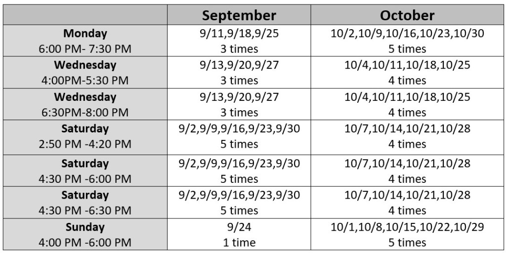 九月和十月绘画课安排 在时间段中可以选择一小时,一个半小时,2个小时的课。根据学生基础和兴趣,教授彩铅、水粉、水彩、素描、丙烯画和油画。我们提供一小时的免费试课,试课请提前预约,我们好准备材料和课程内容。 Cost: $ 40-45/hr(不同课程费用有所不同)Age requirement: 4岁至成人 Where: Redmond, WA 98052 (520高速NE 40th St 出口附近)
